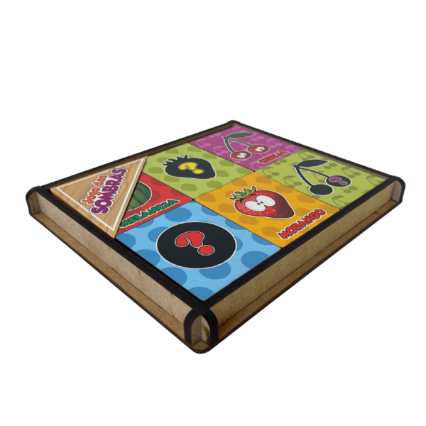 O jogo é muito divertido e estimulante, pois desafia a criança a associar a plaquinha com a figura da fruta com a plaquinha da sombra correspondente, montando os pares.