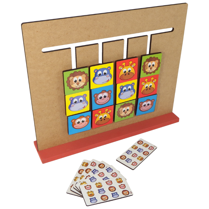 O Jogo dos Bichos desafia a criança a observar, comparar e organizar as peças de acordo com o modelo apresentado nas cartas. O objetivo é posicionar corretamente cada bichinho no tabuleiro, usando atenção, lógica e percepção visual.