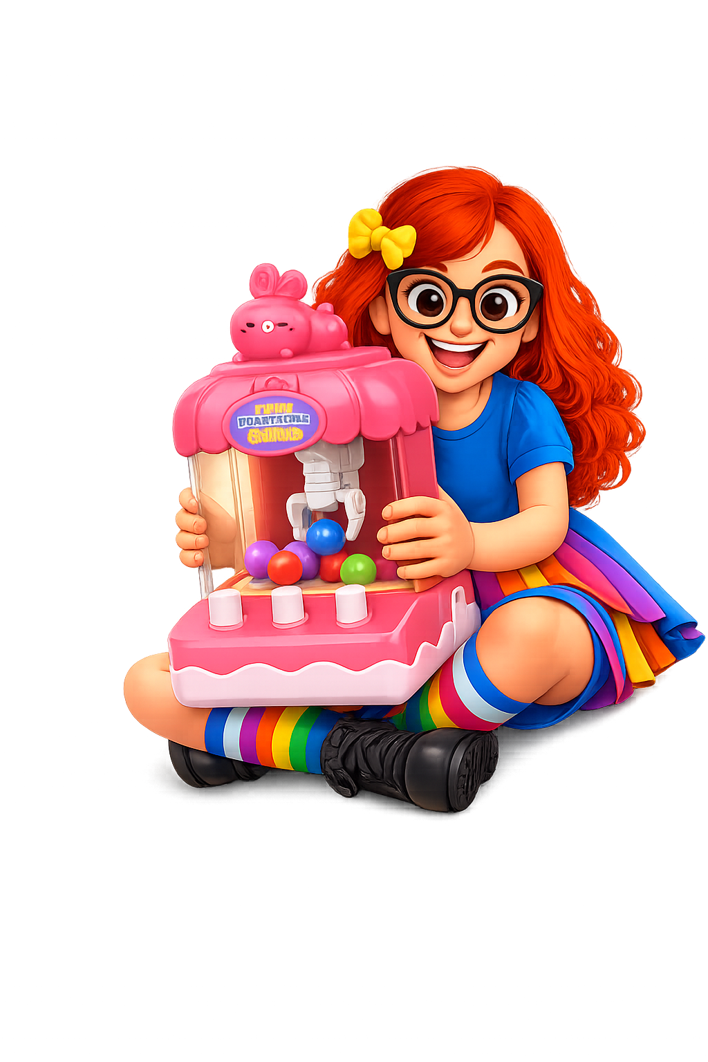 Com essa Máquina Pega-Prêmio, a criança controla a garra usando alavanca e botões, tentando capturar as bolinhas e levá-las até o compartimento de prêmios.